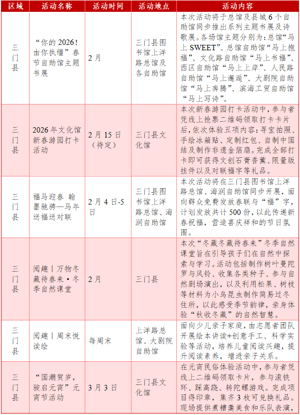 活动地点:三门县图书馆上洋路总馆及各自助馆
