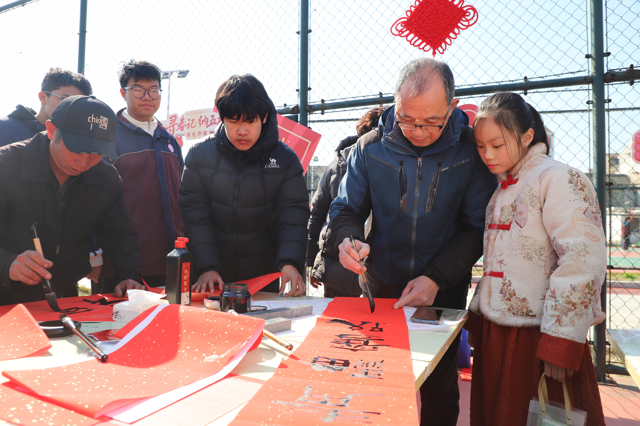 “我们精心划分了老年区和少年区,既保留传统年味记忆,又增添新春趣味。”松门镇团委书记蔡佳慧介绍道。少年区内,糖画手艺人身手不凡,铁勺翻飞间,金黄的糖浆化作龙、马、牛等生肖,引得孩子们惊叹连连;提前备好的糖葫芦红艳欲滴,甜香四溢;市级文化特派员挥毫泼墨,将福字与新春祝福凝于纸上,赠予往来家庭。“希望通过这些充满烟火气的场景,带大家找回记忆里那份纯粹的年味。”