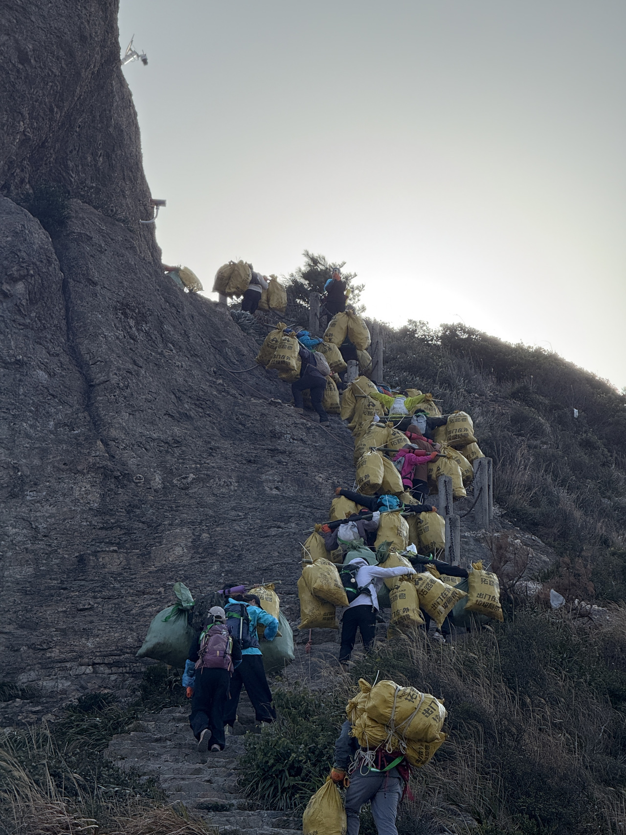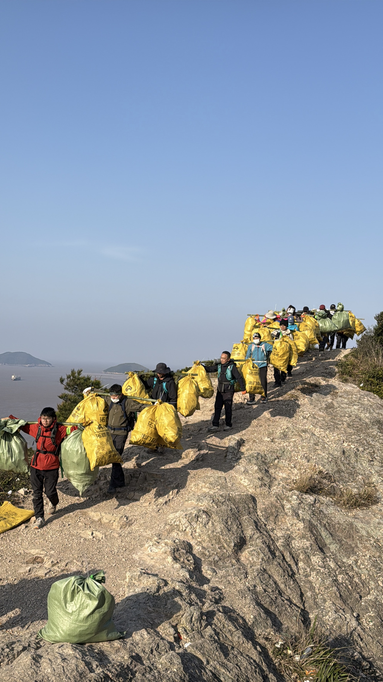 这场水桶岙“净山行动”由嘉兴徒步小分队发起,每一位参与者都被称为“净山勇士”。3月7日早晨7点开始,他们用双手捡拾悬崖峭壁、海边岩石和草丛中的垃圾,来回扛运5次,最终为这条热门徒步路线卸下3166.2斤的“重担”。而这不是他们第一次出发。