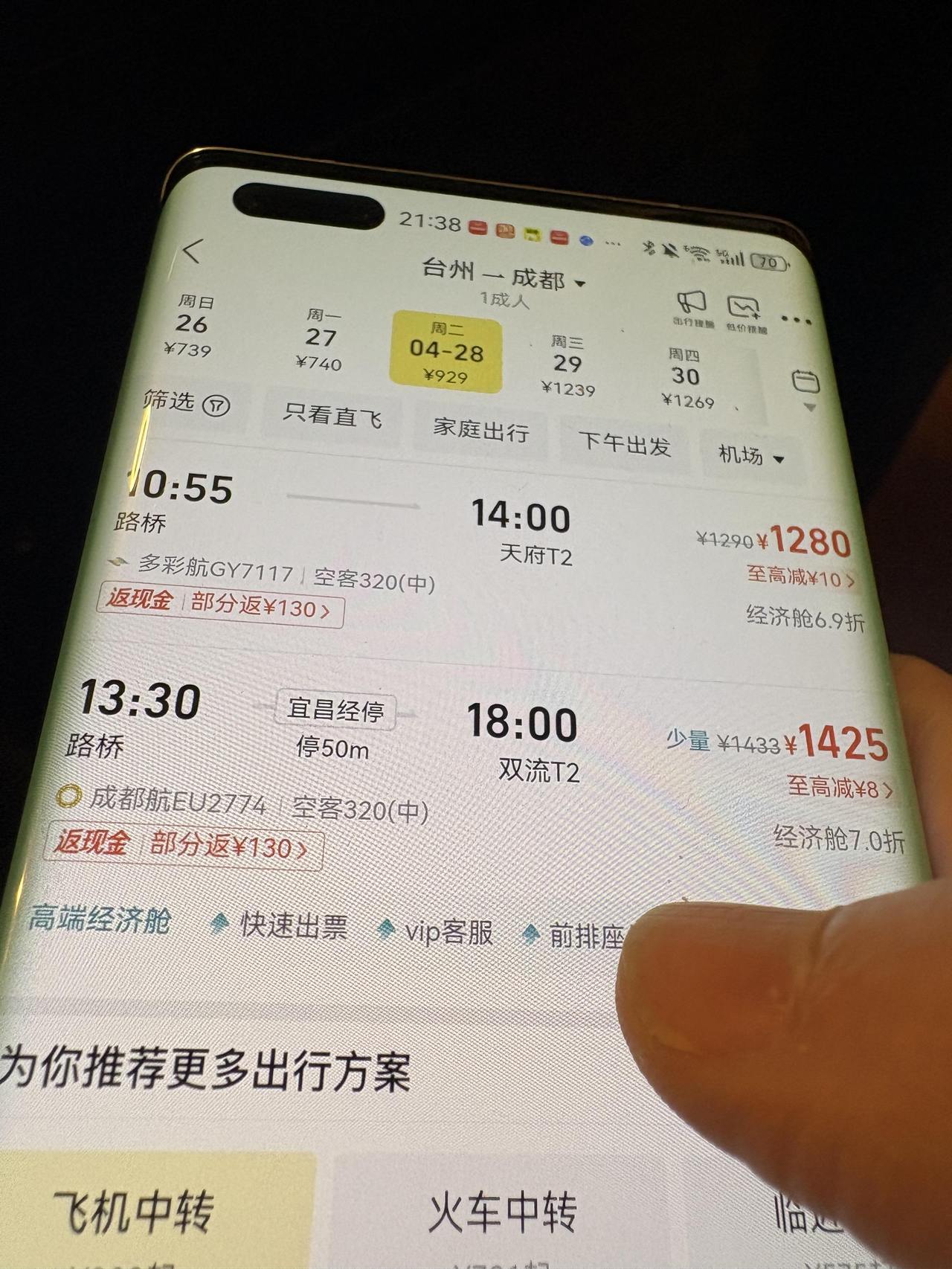 记者的查询也印证了这一变化。在某购票平台上,4月28日台州、温州、宁波和杭州等地直飞成都的单程机票价格在1287元至1577元区间,前一天却能查询到700元左右的机票。不仅仅是成都,北京、西安、重庆等热门旅游目的地的机票价格几乎全线飘红。