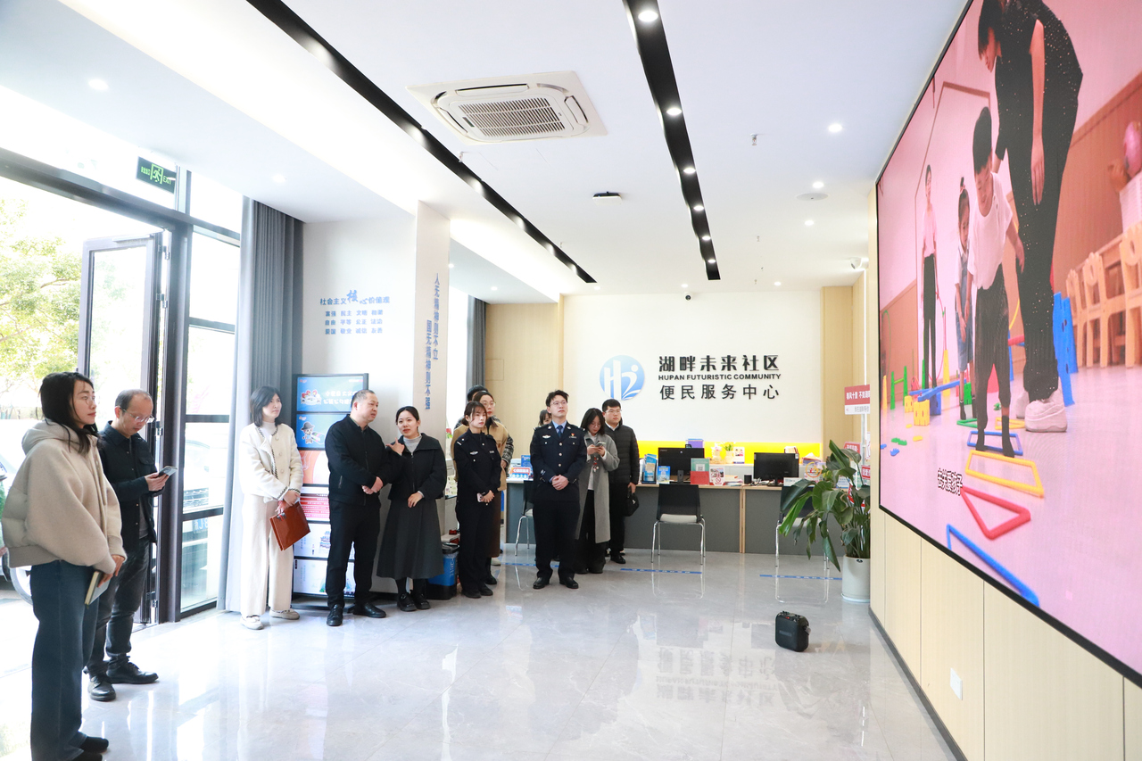 活动前,湖畔社区党总支书记徐慧丽带领参观了湖畔社区党群服务中心,介绍了“五度湖畔”党建品牌建设成果和“社区吹哨 党员报到”工作成效。