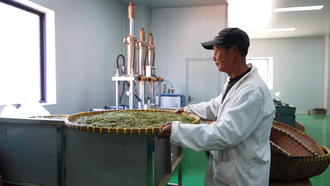 在炒茶间,记者见到了黄智的爷爷——第三代传承人黄忠仁。从早年纯手工炒制,到如今用上现代化设备,茶园的核心炒制工艺,始终由他亲自把关。