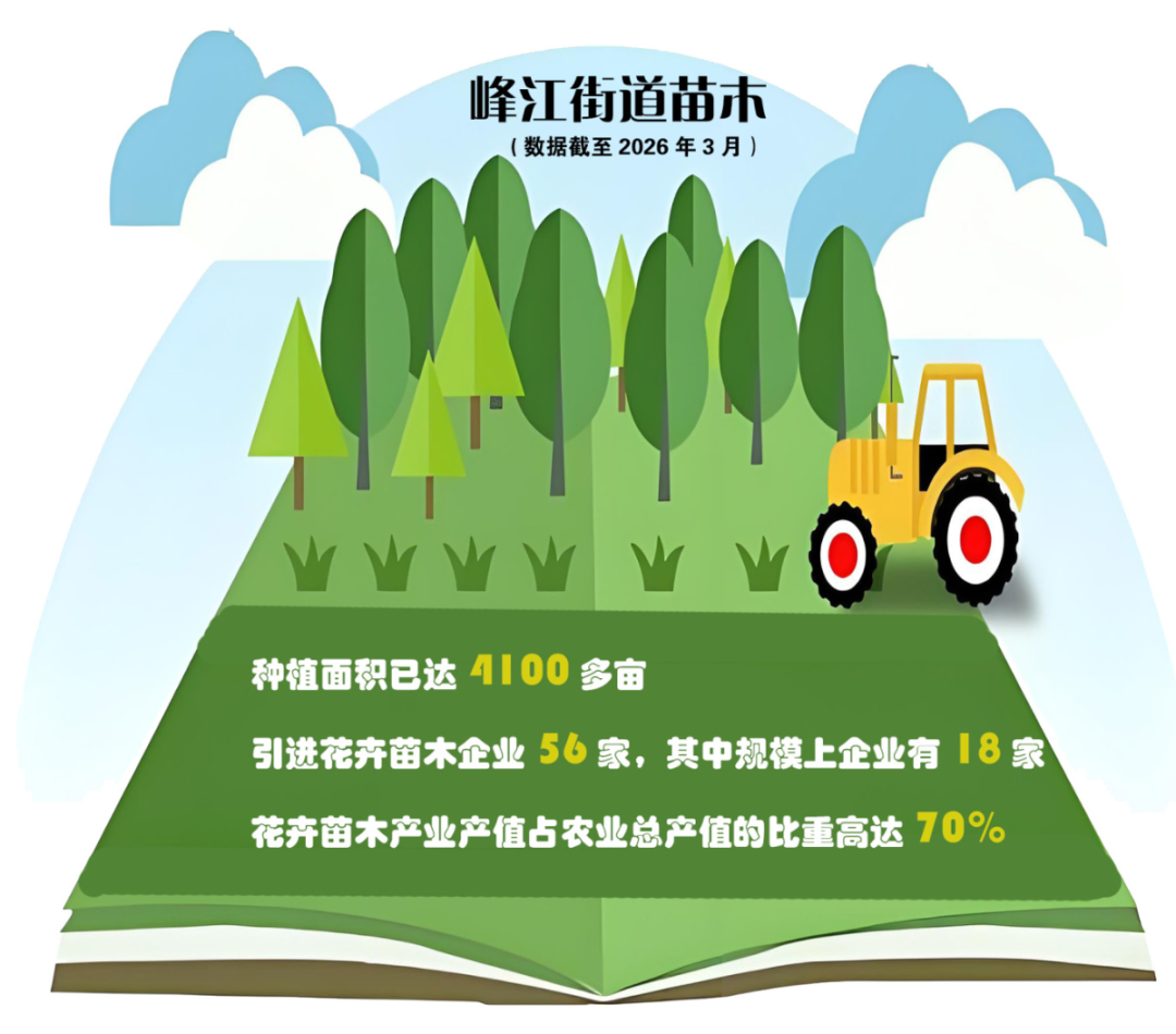 一组数据见证着产业的壮大:截至目前,峰江街道苗木种植面积已达4100多亩,引进花卉苗木企业56家,其中规模以上企业有18家。花卉苗木产业产值占农业总产值的比重高达70%。