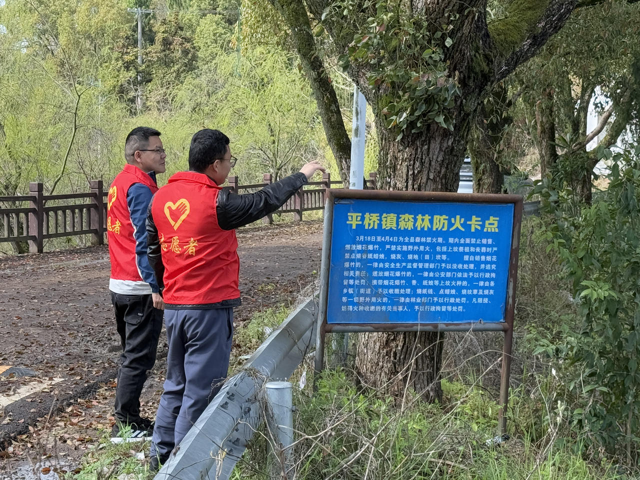 在紫阳宫森林防火卡点,平桥镇东林办事处干部与党员志愿者组成“安全哨兵”志愿服务队,对进山人员、车辆进行严格登记检查。他们逐一排查火种、纸钱、香烛等易燃物品,并耐心向群众讲解森林防火政策。卡点处设置警示标语、张贴防火海报,循环播放防火宣传音频,营造“森林防火、人人有责”的浓厚氛围。