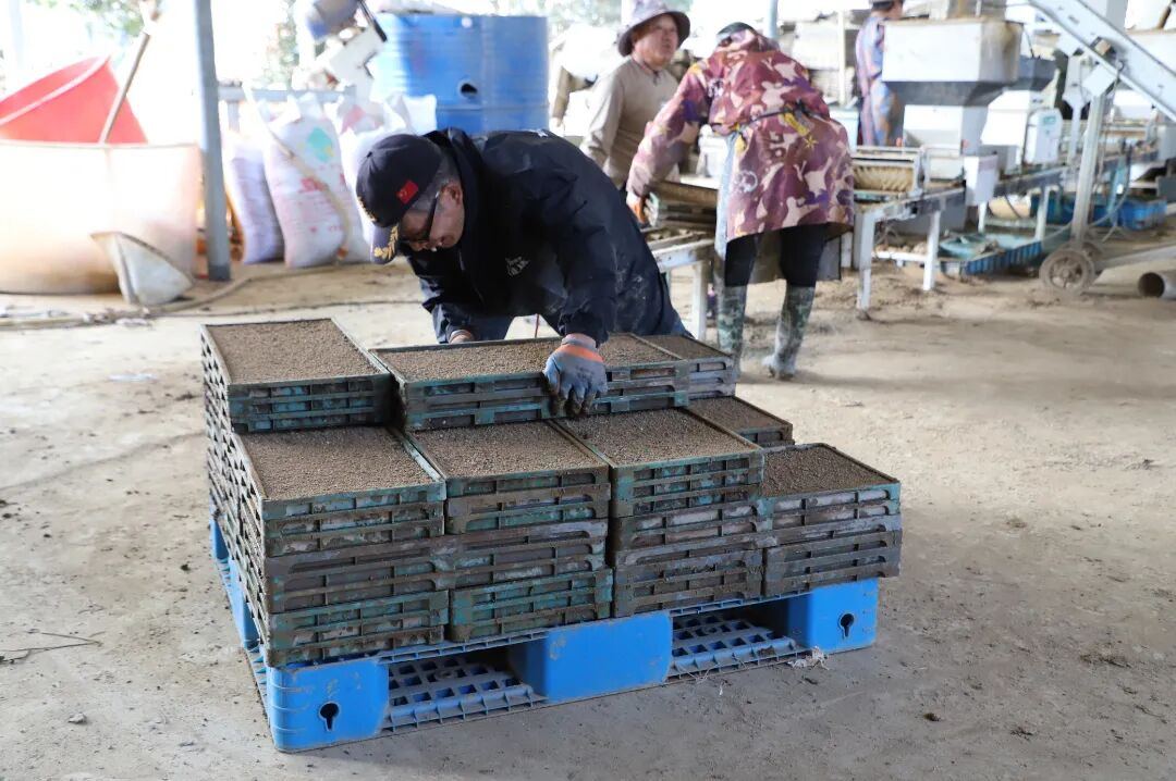 走进基地,全自动播种机、叠盘机有序作业,装基质、洒谷种、覆表土、浇润水,一系列工序一气呵成。仅几秒钟,一个个平整的秧盘就从机器另一端输送出来,随后被机械叉车送入恒温恒湿的催芽室。工人们各司其职,有的整理秧盘,有的检查设备,处处是忙碌的身影。