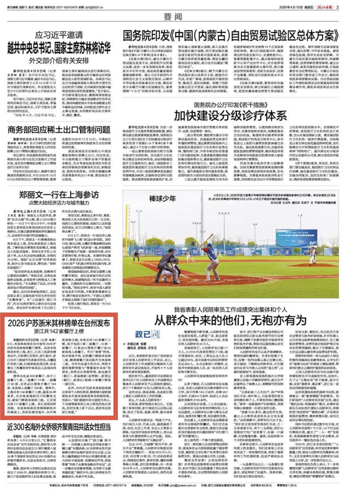 榜单共收录409家餐厅,其中三星餐厅1家、二星餐厅14家、一星餐厅62家,另有必比登推介餐厅164家、米其林入选餐厅168家。榜单中,上海共有156家餐厅上榜,涵盖35种菜系,充分体现海纳百川的餐饮文化,泰安门蝉联米其林三星。江苏省共有111家餐厅上榜。浙江表现同样亮眼。米其林指南在持续深耕杭州的基础上,首次拓展至温州、台州两座美食之城,全省共有142家餐厅上榜,其中包括2家二星餐厅、15家一星餐厅、72家必比登推介餐厅及53家指南入选餐厅。作为“老牌”阵地,杭州表现不俗,如院餐厅蝉联米其林二星,解香楼餐厅成功跃升为米其林二星。而作为东道主的台州,凭借丰富的海鲜资源与“尊重食材本味”的理念,首秀交出亮眼答卷,刻龙壹号(椒江)、老扁酒家(金带路)、新荣记(椒江)、新荣记(临海)4家餐厅跻身一星行列。