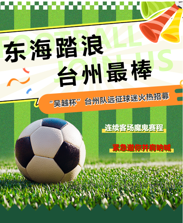 2026年“吴越杯”积分赛阶段,台州队将迎来连续客场远征的魔鬼赛程,先后挑战丽水、舟山、宁波、衢州、湖州。客场作战压力倍增,球队紧急招募“第12人”,用统一声浪为台州队将士注入决胜力量。