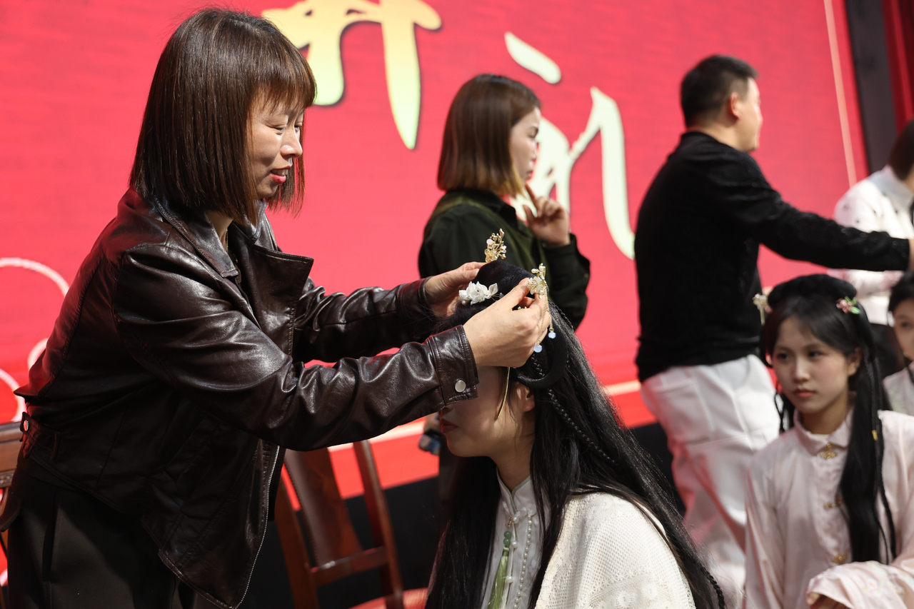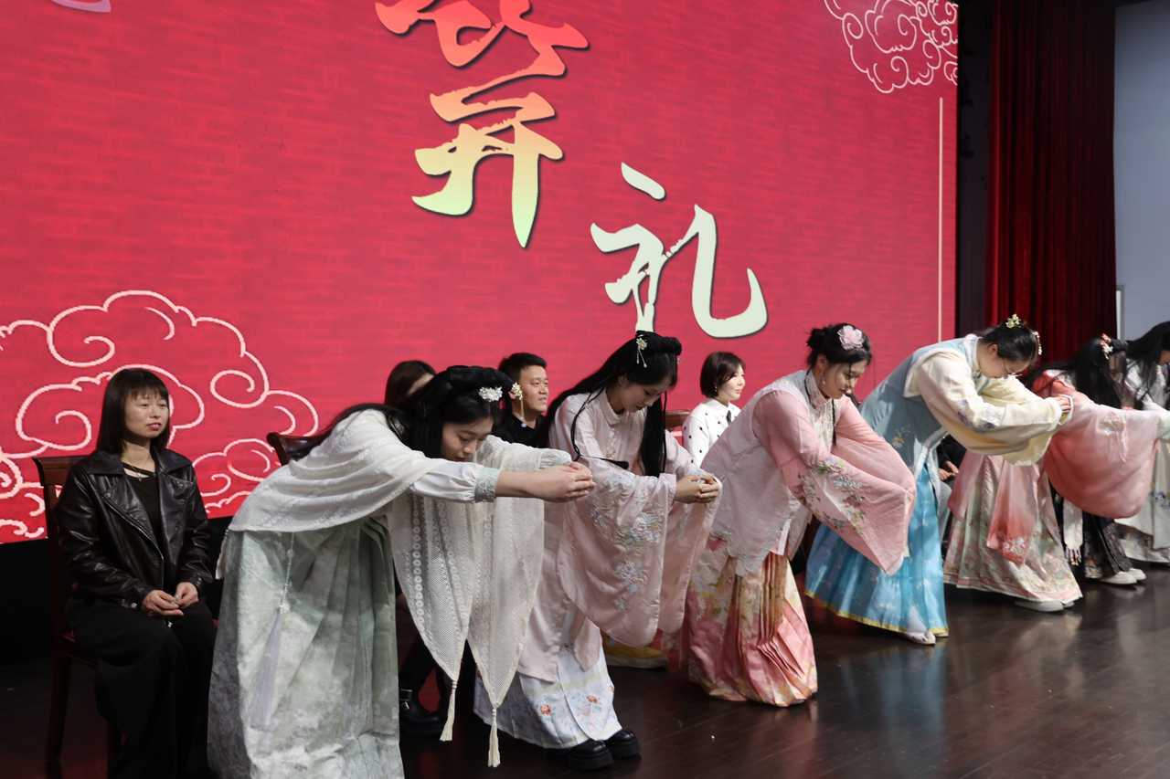 活动在一首《如愿》歌曲中拉开序幕。随后,氛围感拉满的加冠笄隆重登场。在主持人的礼祝下,各班学生代表与家长依次登台。学生们按照古人冠礼、笄礼过程,作揖行礼,并接受长辈祝福,一幕幕中华礼仪之邦的风范与魅力在现场完美呈现。