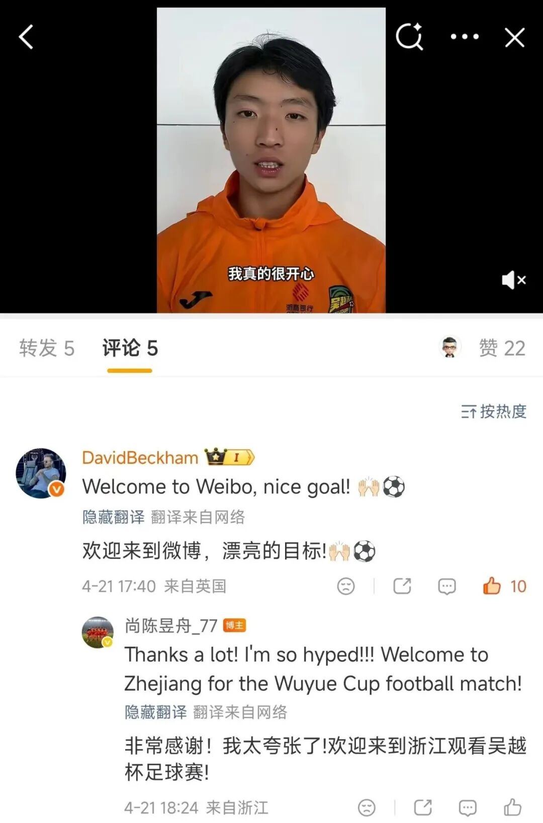 4月21日下午,国际知名足球运动员贝克汉姆在微博点赞台州队77号球员尚陈昱舟“Welcome to Weibo, nice goal!”