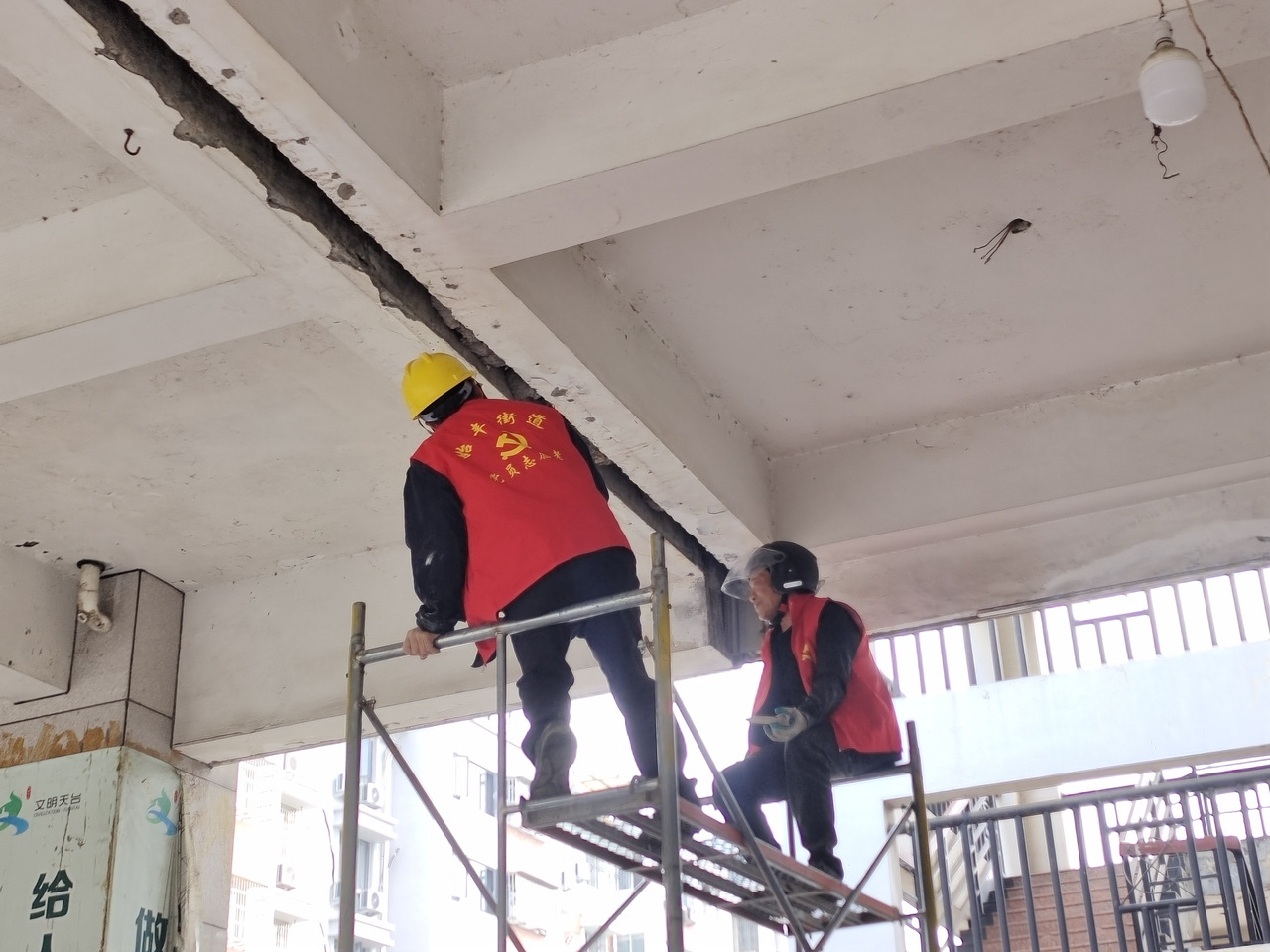 群众安危大于天,应急处置刻不容缓。天元社区第一时间响应部署,迅速组织党员干部开展安全隐患专项清理行动。工作人员火速抵达现场,第一时间拉起安全警戒线,耐心劝导商户与行人绕行避让;参与作业的党员干部不惧高空作业风险,手持撬棍、锤子等工具,对松动、空鼓的水泥块逐一敲除清理,细致清扫现场残渣,全面排查消除安全死角。大家分工协作、高效配合,以最快速度完成隐患整治,成功拆除这一悬在群众头顶的“定时炸弹”,切实守护了辖区群众生命财产安全。