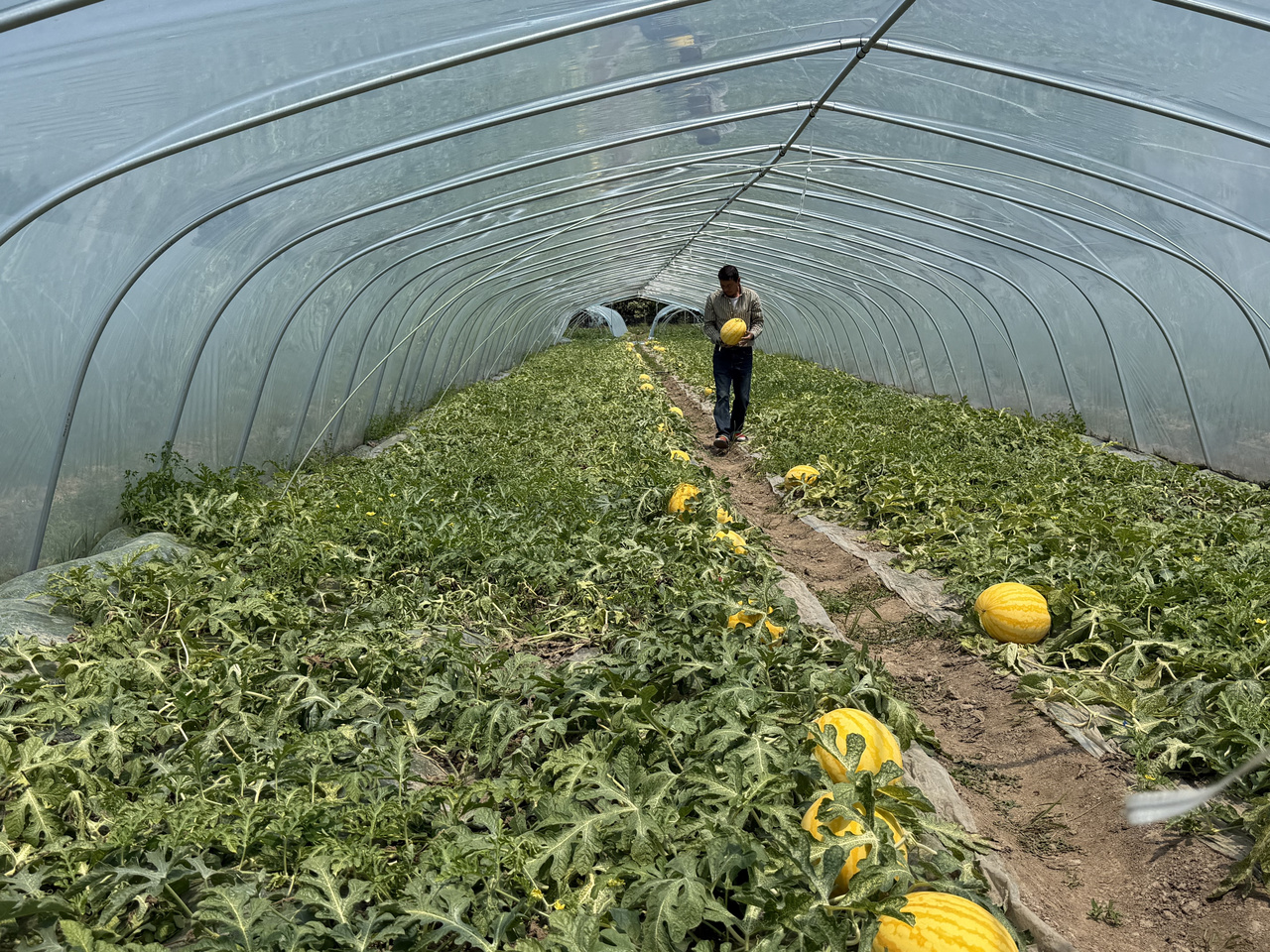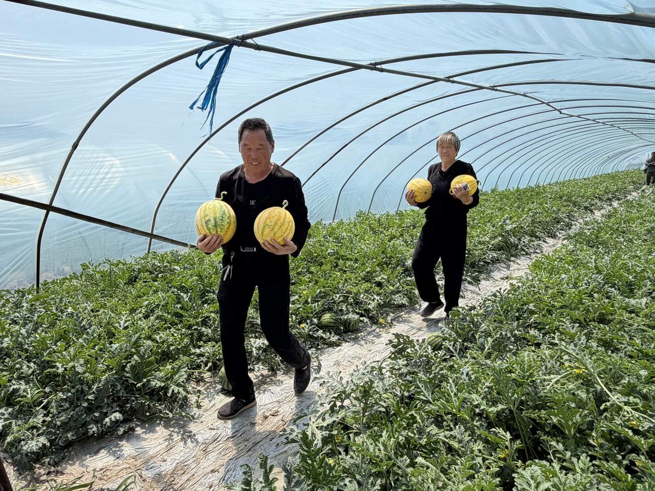 有着30年种瓜经验的种植户李文国,今年共种植西瓜50多亩,主打早佳8424品种,并试种3亩“小黄人”新品西瓜。受持续降雨影响,今年西瓜产量略有下降,但果品品质稳定。自4月20日西瓜成熟上市以来,李文国夫妇每日凌晨3点采摘瓜果,日均采收西瓜5000余斤。此外,女儿借助短视频线上带货,助力西瓜日销量提升20%以上。