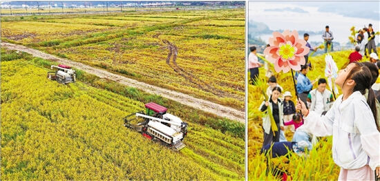 风吹稻浪谷飘香。眼下,我省各地迎来水稻丰收季。左图:在玉环,大型机械轰鸣于“海水稻田”上。右图:在淳安,游客徜徉于金黄色的稻田中,共享丰收喜悦。