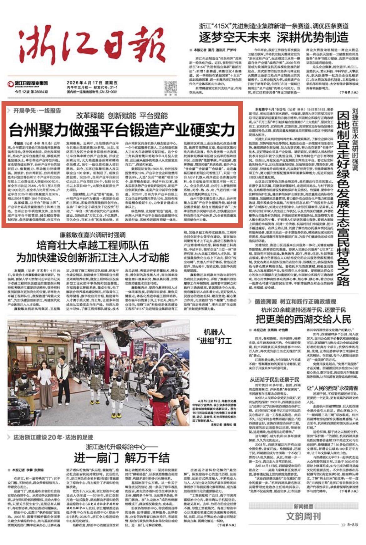创新赋能,让产业“筋骨”更强。台州把产业平台作为建设一流创新生态的主阵地,积极培育高能级科创平台,实施“千家企业千项技改千亿投资”行动,“一平台一策”推动现代化产业体系建设,加快形成“万亿工业、千亿集群、百亿企业、百家上市”的发展态势。在台州湾新区具身机器人概念验证中心,一个个家庭服务机器人、工业制造机器人正在各自场景里反复训练。这个长三角具身智能训练场今年3月投入使用,正让越来越多的机器人从实验室走向工厂、商场和家庭。